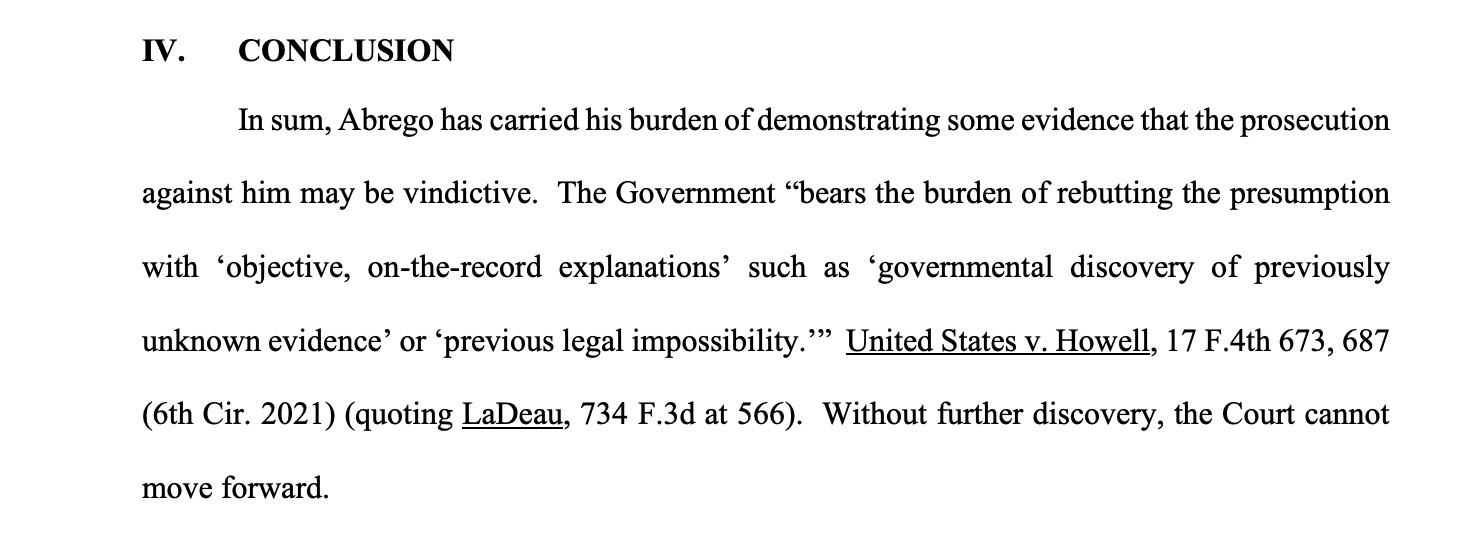 Abrego Garcia has convinced the court that there is a charge of vindictive prosecution against him to be answered. The DOJ now has to show why this isn’t vindictive.